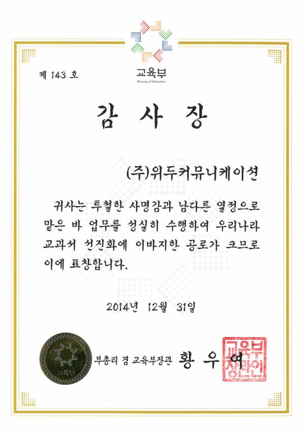감사장 제 143호 페이지 정보 작성자 WeDu 댓글 0건 조회 5,907회 작성일 19-05-30 19:33 본문 2014-12-31 감사장 제 143호 교과서 선진화 부총리 겸 교육부장관 황우여 List Previous산업통상자원부 표창장 19.05.30 Next한국여성벤처협회 표창장 19.05.30